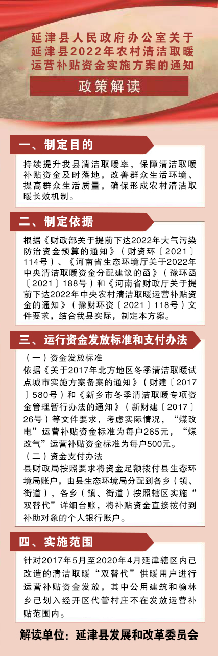 根据《财政部关于提前下达2022年大气污染防治资金预算的通知》(财资环〔2021〕114号)、《河南省生态环境厅关于2022年中央清洁取暖资金分配建议的函》(豫环函〔2021〕188号)和《河南省财政厅关于提前下达2022年中央农村清洁取暖运营补贴资金的通知》(豫财环资〔2021〕118号)文件要求,为切实做好2022年农村清洁取暖运营补贴资金发放工作,保障群众清洁取暖、温暖过冬,结合我县实际,制定本方案。